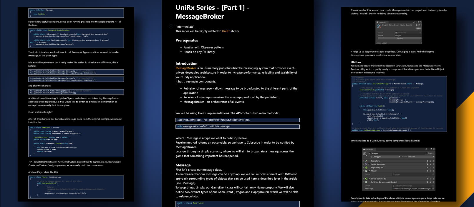 MessageBroker.Default.ReceiveMessage<GameEvent>();Additional benefit to using ScriptableObjects and a base class is keeping MessageBroker abstraction well separated. So if we would like to switch to different implementation or concept, we can easily do it in one place.