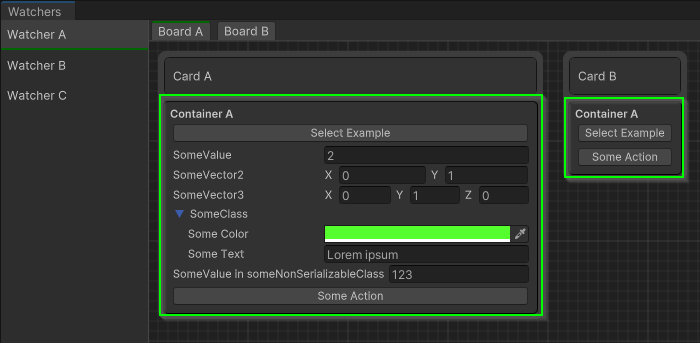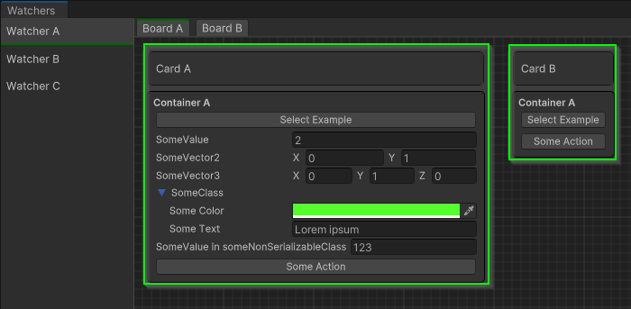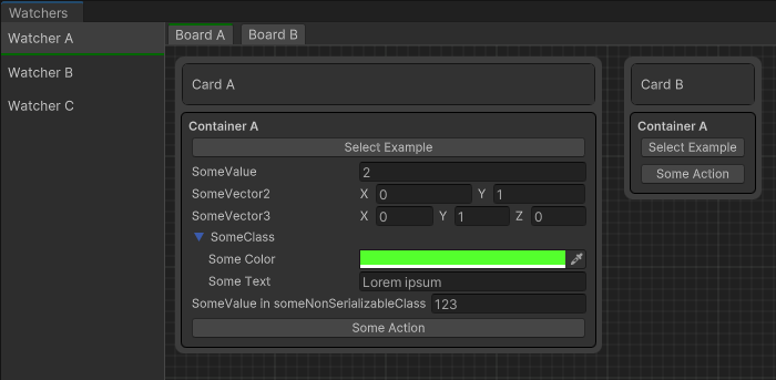 Watchers are created from bunch of UnityEngine.UIElements and UnityEditor.UIElements. Please see blow for detailed introduction to all core classes, methods and use case examples.
