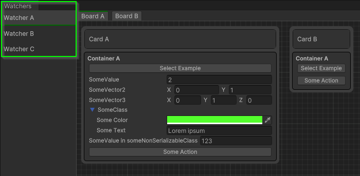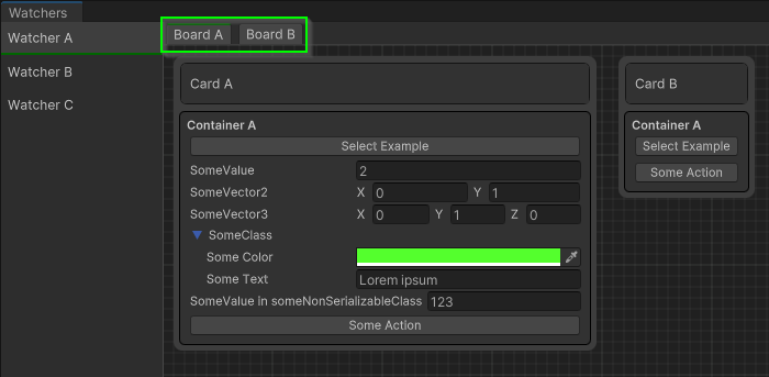 Board inherits from Unity native GraphView. It is a place where you can add your Nodes. Boards can contain multiple cards.